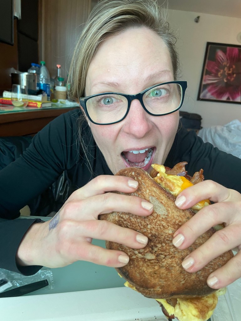 By the time we were headed back from the run to the hotel, hunger was setting in. There was a great breakfast/sandwich shop in the hotel… and I knew they had coffee. That was my priority really. But the surprise was the incredible breakfast sandwich, of which I really needed only half. But oh, was it good, and I was very hungry! As a fun shot to send to the kids – a ‘look at the fun mom is having’ – we took this quick picture.